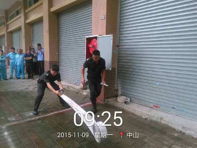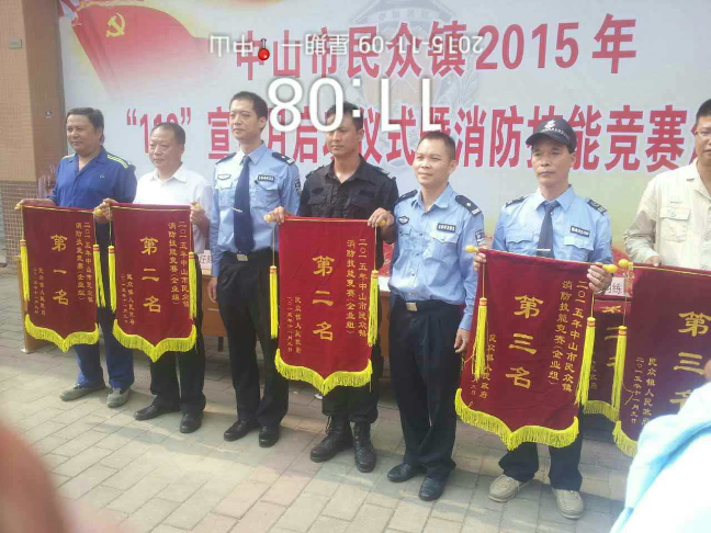 2015年11月9日8时30分,我公司驻中山欧科电子有限公司保安项目部在项目主管雷刚的带领下,选拔4名保安员,代表企业参加当地政府组织的“全国消防日消防技能竞赛”。参加竞赛的保安员训练有素,具备过硬的业务素质及较强的实际操作能力。在比赛中,参赛保安员正常发挥,把优良的业务技能和精神面貌充分展现在赛场上,展现出我公司保安员业务技能精、精神面貌好的优良作风,受到赛事组委会的一致好评,并荣获“企业组消防技能竞赛”第二名。